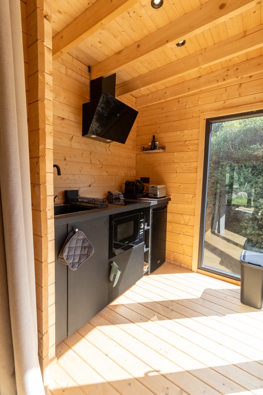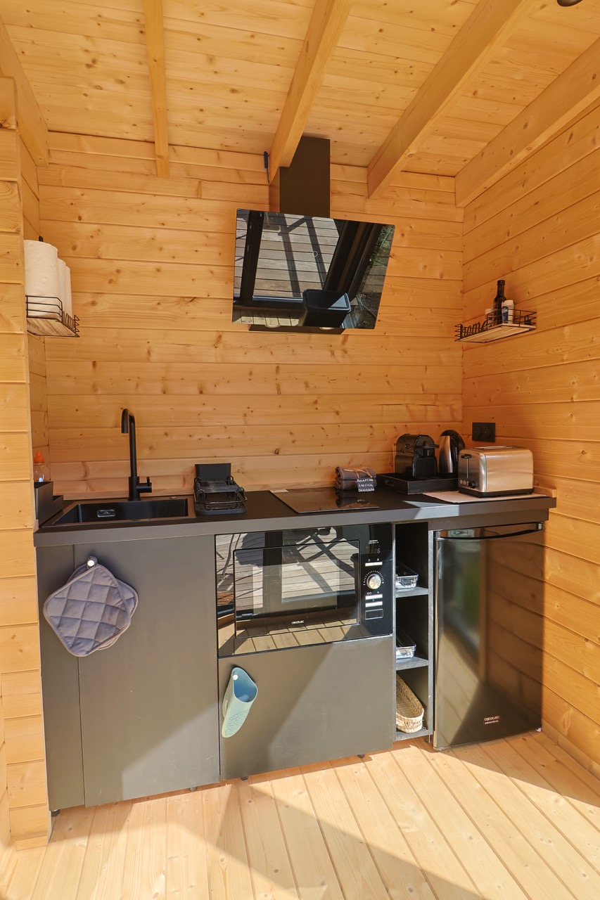 Une petite cuisine entièrement équipée : four, plaque vitrocéramique, micro-ondes, réfrigérateur, congélateur, lave-vaisselle, bouilloire, machine à café.